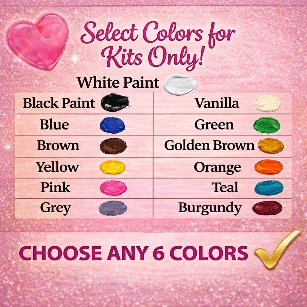 Acrylic Paint Colors: Black, White or Vanilla, Red, Blue, Green, Brown or Golden Brown, Yellow, Orange, Pink, Teal, Grey, Burgundy, Purple, Gold, or Silver.