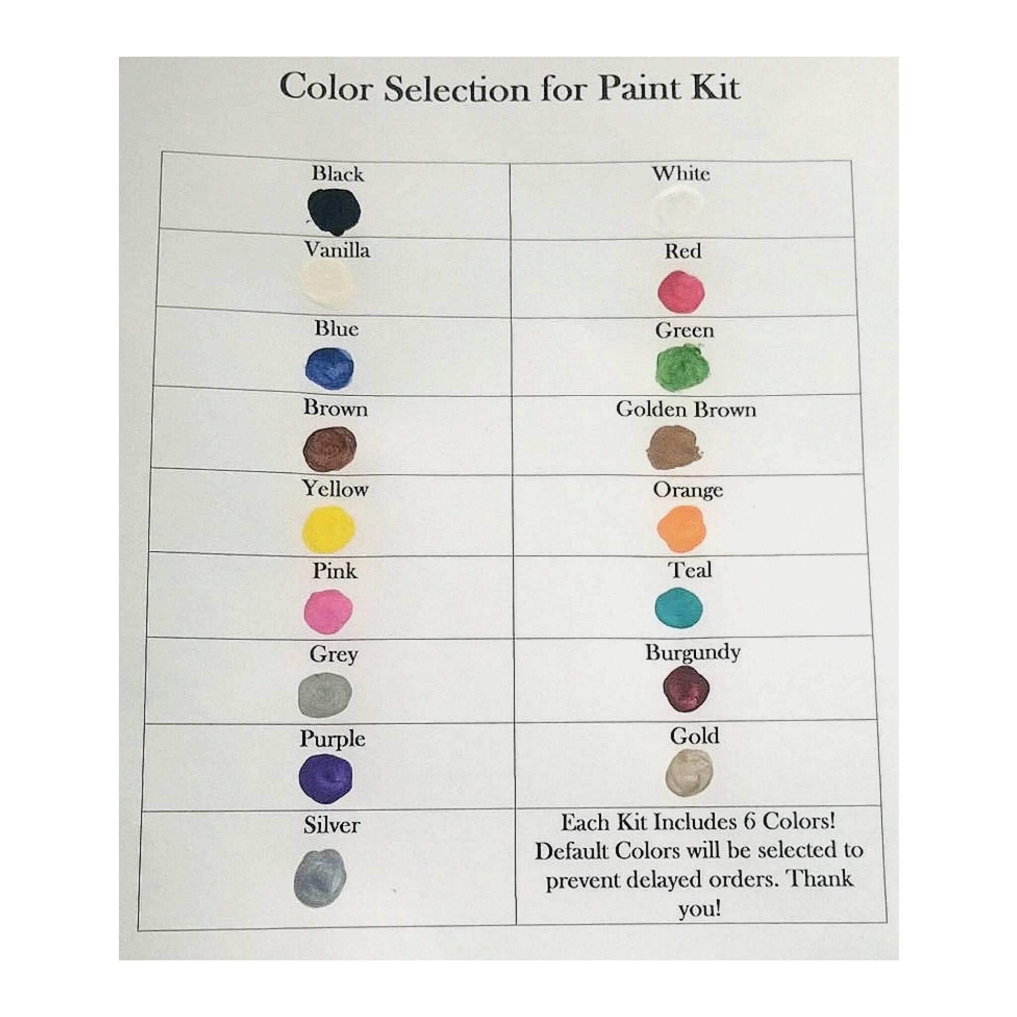 **Available Acrylic Paint Colors, are: Black, White or Vanilla, Red, Blue, Green, Brown or Golden Brown, Yellow, Orange, Pink, Teal, Grey, Burgundy, Purple, Gold, or Silver.** (THE DEFAULT PAINT COLOR SELECTION are…BLACK, BROWN, WHITE, RED, GREEN, AND BLUE).