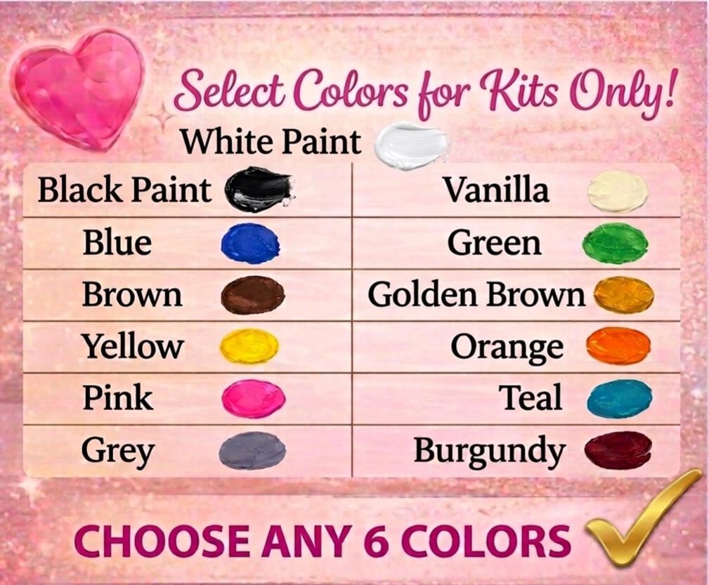 **Available Acrylic Paint Colors, are: Black, White or Vanilla, Red, Blue, Green, Brown or Golden Brown, Yellow, Orange, Pink, Teal, Grey, Burgundy, Purple, Gold, or Silver.** (THE DEFAULT PAINT COLOR SELECTION are…BLACK, BROWN, WHITE, RED, GREEN, AND BLUE).