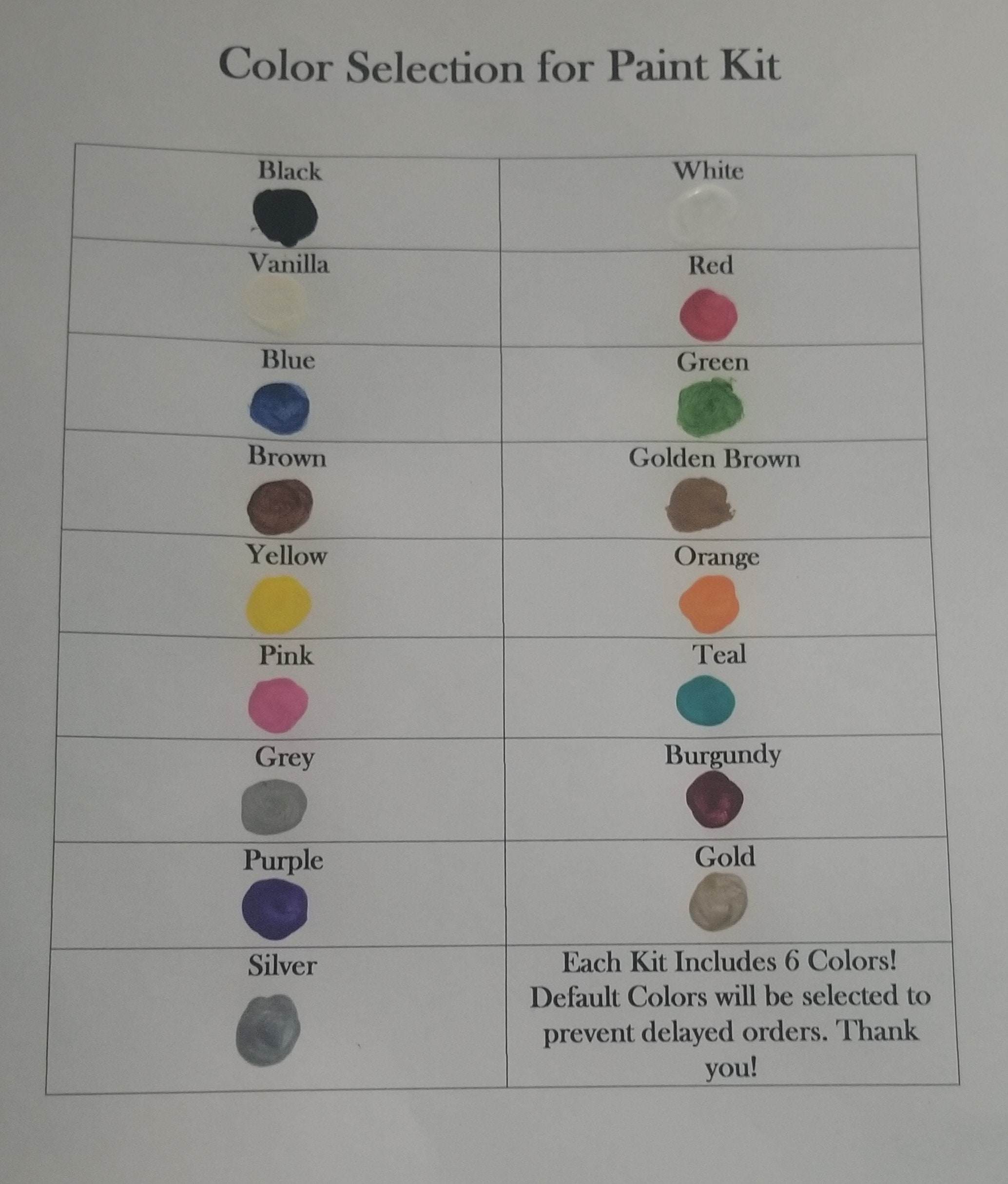 **Available Acrylic Paint Colors, are: Black, White or Vanilla, Red, Blue, Green, Brown or Golden Brown, Yellow, Orange, Pink, Teal, Grey, Burgundy, Purple, Gold, or Silver.** (THE DEFAULT PAINT COLOR SELECTION are…BLACK, BROWN, WHITE, RED, GREEN, AND BLUE).